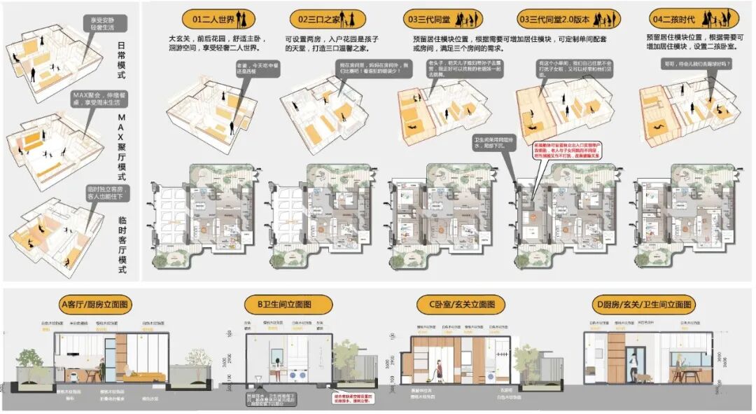 項目參賽戶型建筑面積為69.5㎡,定位為“小而美”的第四代花園住宅。我們深入分析南寧市場需求,以“花園式住宅,裝配式工廠化生產、全齡段多場景可變住宅” 為產品定位 ,旨在破解住宅建筑難點,在有限面積內創(chuàng)造無限可能。